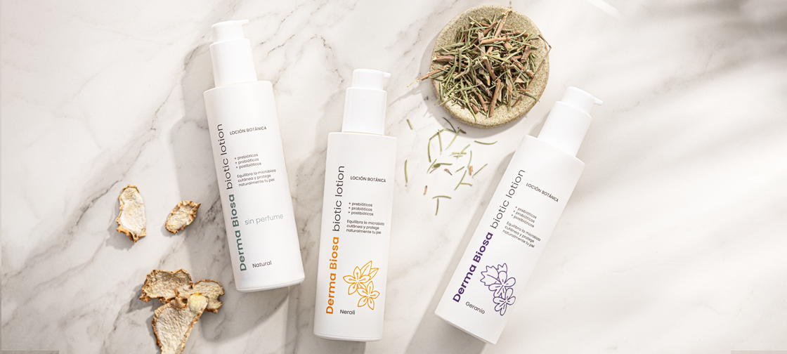 Derma Biosa es una loción biótica con pre, pro y postbióticos combinados con extractos de flores, hojas, frutos y raíces.